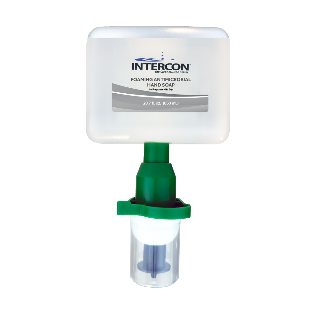 Intercon’s Foaming Antimicrobial Hand Soap is E2 Rated and contains 0.6% PCMX. It is intended for use in medical and food production facilities. It’s ideal where a dye and fragrance-free formula is desired. The product includes moisturizers and is formulated to reduce bacteria on hands.
