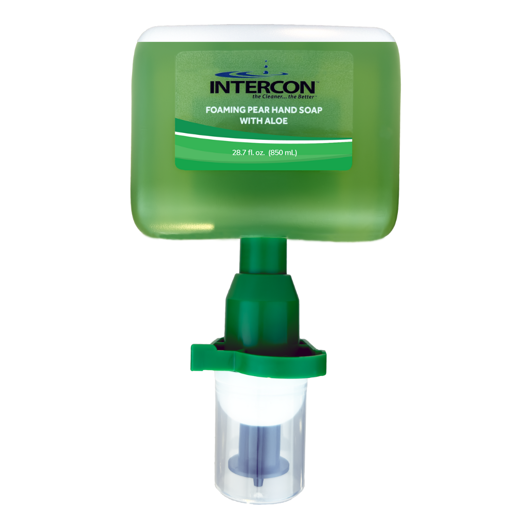 Intercon’s Foaming Pear Hand Soap with Aloe offers a liquid foaming formula that is dispensed as foam when used with our refillable foaming dispensers. Our mild and gentle formula is built with aloe to keep hands feeling soft and clean while emitting a subtle pear fragrance.